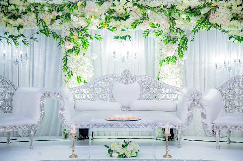An exquisite wedding stage, furniture, luxurious backdrops and stunning table centrepieces